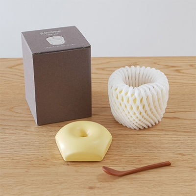 | 容量 | ■内容量・サイズ/製造地 りんごの形のシュガーポット pomme 黄王 1個 約W75×D71×H100mm(スプーン含む) 製造地:愛知県清須市 木製スプーン 1本 約W21×D17×H95mm 製造地:インドネシア ■原材料 半磁器、木(サオ) |