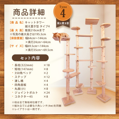 柱が4本ある為、w型やL型やロ型に柱を床に配置して組み上げるだけで自由なキャットタワーを造る事が可能です。