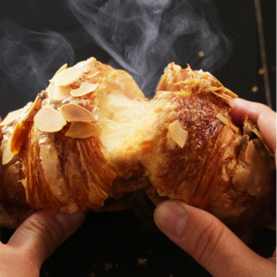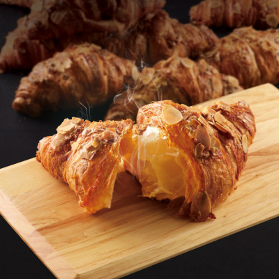 クロワッサン・アマンドは、味豊かなフランス産の発酵バターを使したクロワッサンに、アーモンドスライスと名古屋フランスオリジナルのダマンド(アーモンドパウダー、卵、粉糖、ゲランド塩)をトッピングしたリッチ感あるアーモンドクロワッサンです。