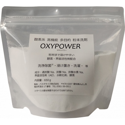 | 容量 | ■お礼品の内容について ・酸素系漂白剤 高機能酸素系洗剤 OXYPOWER[650g×5袋セット] 原産地:愛知県/製造地:愛知県 ■原材料・成分 過炭酸Na、炭酸Na、炭酸水素Na、界面活性剤、水軟化剤、酵素 |