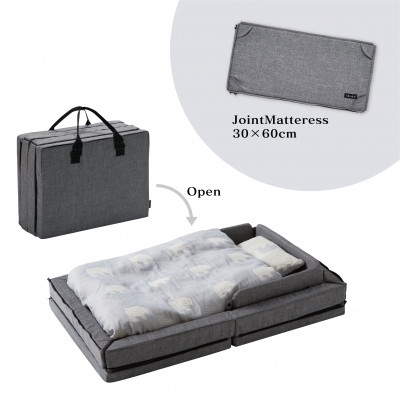 開けてすぐ使える寝具一式(マットレス、掛け布団、敷きパッド、枕、傾斜クッション)。リビングや里帰り、旅行先でも赤ちゃんの安心できる寝場所を簡単に持ち運べます。