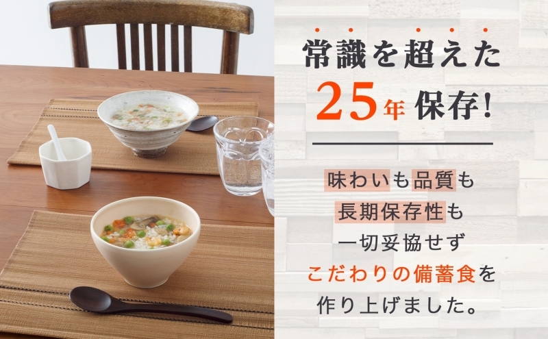 高度なフリーズドライ加工で、水分だけを極限まで(最大98%)除去したことと、缶内の酸素を取り除き、缶を確実に密封することによって、3~5年の保存が一般的な非常食の中で、25年間もの超・長期保存が可能にさせました。