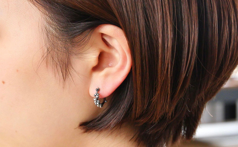 黒いぶし仕上げをしたシルバー925の小さなフープピアスに大小の”つぶ”で自然界のどこかにありそうな有機的な世界を表しています。