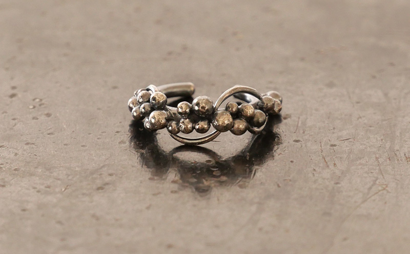 小さなイヤーカフに黒いぶし仕上げをしたシルバー925の”つぶ”と”ツル”で、自然界のどこかにありそうな有機的な世界を表しています。
