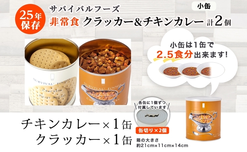 25年保存のおいしい備蓄食(非常食) サバイバル(R)フーズ 小缶クラッカーとチキンカレー 約5食分 缶切り付サバイバル フーズ クラッカーチキンカレー 各1缶 災害対策 備蓄 保存食 愛知県あま市