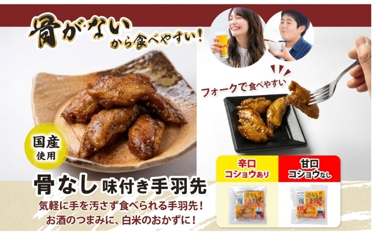 ガツンとした濃厚旨タレ!骨なし手羽先揚げ2種をお届け。