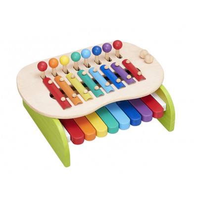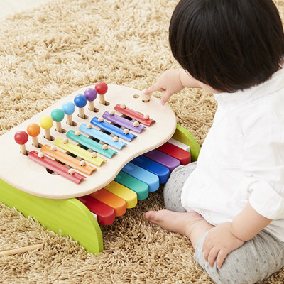 鍵盤を押すと、音と連動して丸いモチーフがぴょんぴょんと跳ねます。音と動きが連動することで、相乗効果で大きな喜びを感じる事ができます。音と動きの関係性に興味を持つきっかけになる製品です。天板の上の鉄琴をスティックで叩いて遊ぶこともできます。強弱などの指先の訓練、創造力、発想力、指の動きと位置を空間的に認識し覚える力、メロディーを覚える力などを養う事ができます。