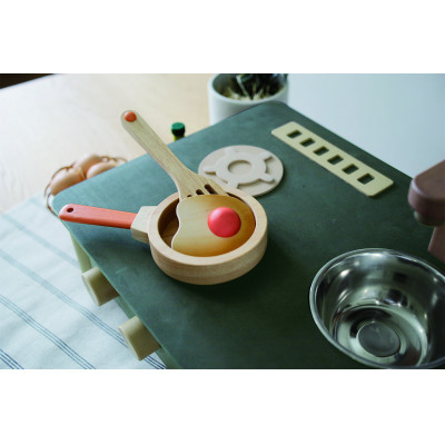 夕方になると台所からトントン、ザクザク、グツグツいいにおい。水栓をきゅっとひねって、シンクで野菜を洗ったら、ピーラーでていねいに皮むき。まな板でトントン切ったら、おなべに入れて火にかけよう。グツグツしたらつまみをひねって弱火で煮込んで。グリルのお魚は焼けたかな?ちょっとだけ引き出して中を確認。そんなストーリーが思い浮かぶ台所。誰かのためを思ってつくる、おいしいごはん。ままごとあそびはそんな思いやりのこころを育みます。日常のくらしの1コマが再現できるような機能を、コンパクトなサイズにすべて収めました。日本の職人が手作りした、どんなおうちにもすっと馴染む自然でおしゃれな色あいで、くらしに寄り添う木のままごとキッチンです。