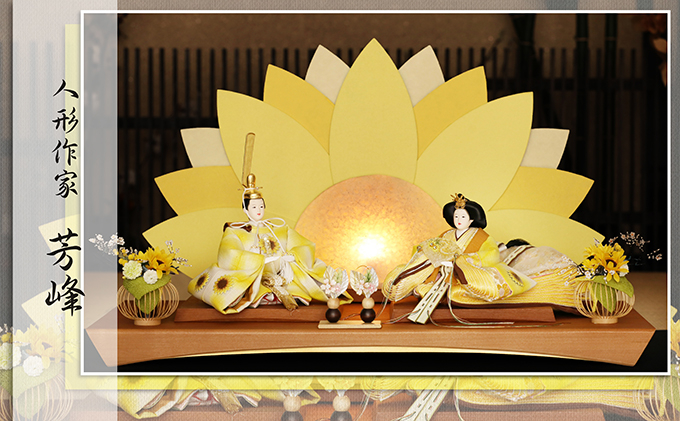 【伝統工芸士 二代目芳峰(北川慎也氏)】が手がける、ひまわりをモチーフとした雛人形です。