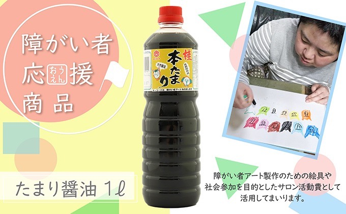 障がい者アートのオリジナルラベルのたまり醤油をお届けします。