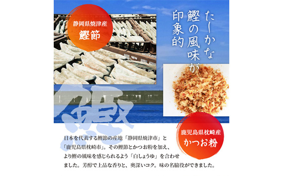 静岡県焼津産の鰹節に鹿児島県枕崎産の鰹粉を加え、鰹の風味を生かすために「白しょうゆ」を加えました。水出し抽出した、香り立つ本格かつおだしです。