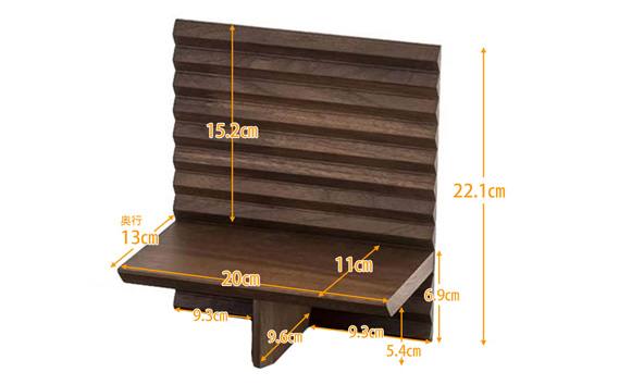 | 容量 | ■素材 材質:ウォールナット 表面仕上げ:ウレタン仕上げ 原産国:日本 ■サイズ(cm) スタンド:高さ22.1×幅20×奥行13cm ベース:厚さ1.7×幅44×奥行26cm ■重量 約2.5kg |