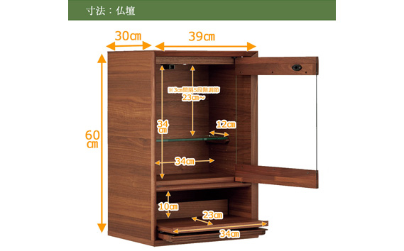 | 容量 | ■素材 主芯材:木質繊維版 表面仕上げ:ウレタン仕上げ 正面表面材:台輪/ウォールナット厚板貼り 戸板/ウォールナット無垢 原産国:日本 ■サイズ(cm) 仏壇:高さ60×幅39×奥行30cm ■重量 約18kg |