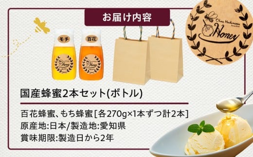 容量 | ■お礼品の内容について ・百花蜂蜜、もち蜂蜜[各270g×1本ずつ 計2本] 原産地:日本/製造地:愛知県 ■原材料・成分 国産蜂蜜 |