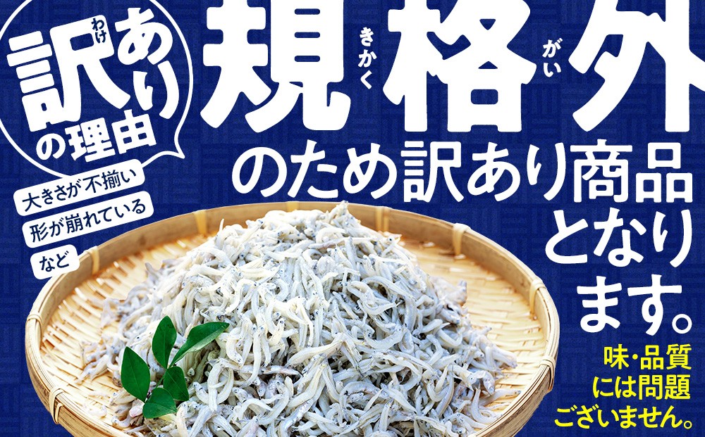 しらす漁は目の細かい網で行われるため、サイズが不揃いの訳あり品となりますが、味・鮮度は正規品同様です。
