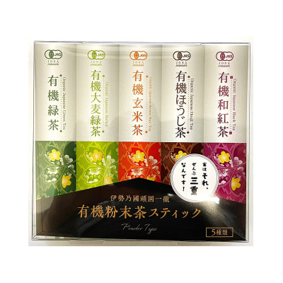 | 容量 | ■お礼品の内容について ・有機粉末茶スティックティ[5種各4本 20本入] 原産地:三重県/製造地:三重県 ■原材料・成分 有機緑茶・有機発酵茶・有機大麦若葉・有機米 |