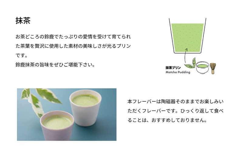 『抹茶』はお茶どころの鈴鹿でたっぷりの愛情を受けて育てられた茶葉を贅沢に使用した素材の美味しさが光るプリンです。
