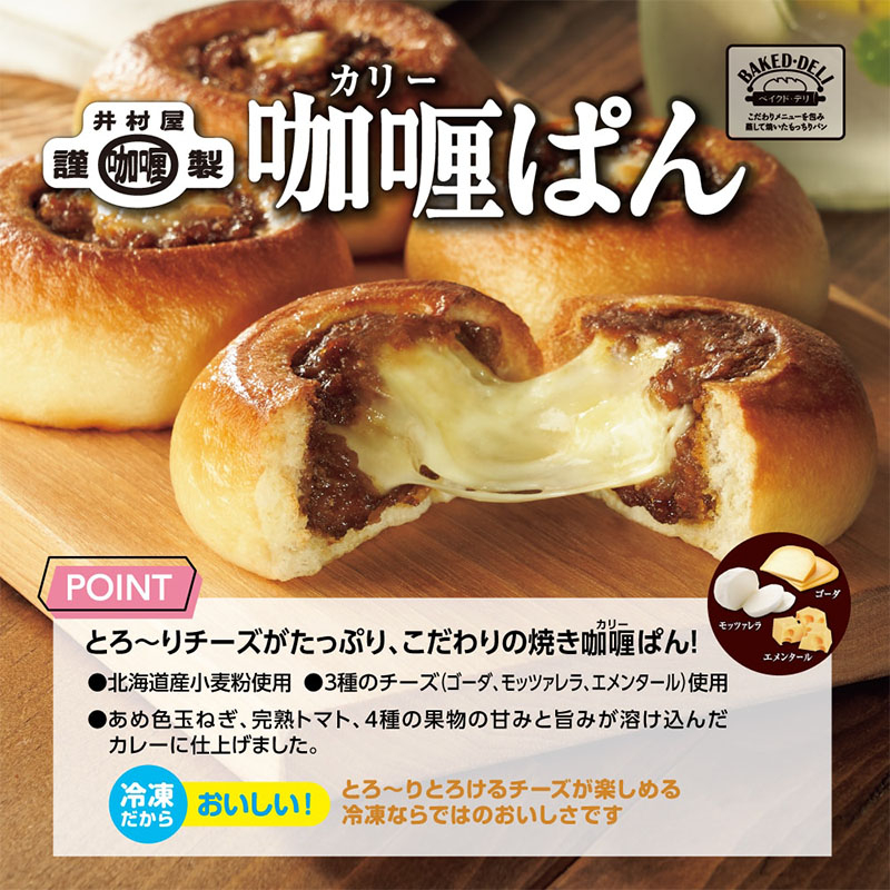 とろけるチーズがたっぷり楽しめる、冷凍でストックでき、家で焼きたてのおいしさを味わえるヘルシーな「井村屋謹製カリーぱん」です。