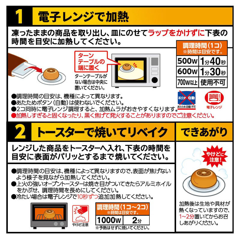 「電子レンジ解凍」+「トースターでのリベイク」でご家庭で手軽に焼き立てのおいしいカレーパンをお楽しみください!