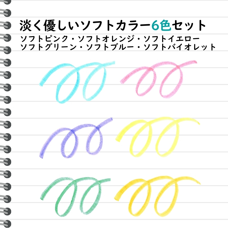 摩擦熱で筆跡を消せるフリクションシリーズの蛍光ペン!こちらは淡く優しいソフトカラーの6色セットです。
