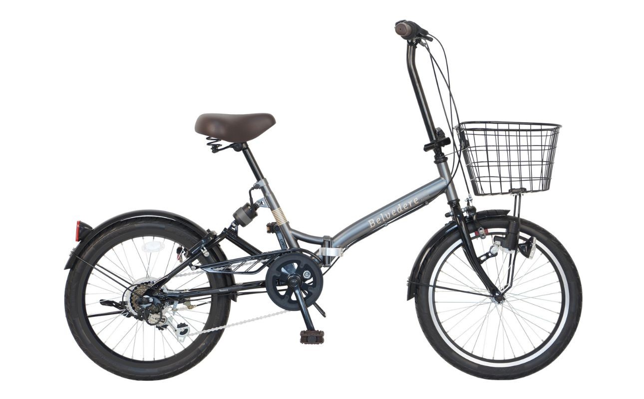 段差も安心。快適な乗り心地のノーパンク折りたたみ自転車 ノーパンク 折りたたみ自転車 ベルヴェデール Belvedere チャコール 20インチ 6段変速 リアサス・前カゴ・LEDライト付|武田産業 フォールディングバイク 人気返礼品 空気入れ不要 パンクしない 通勤 通学 三重県 四日市市 ふるさと納税