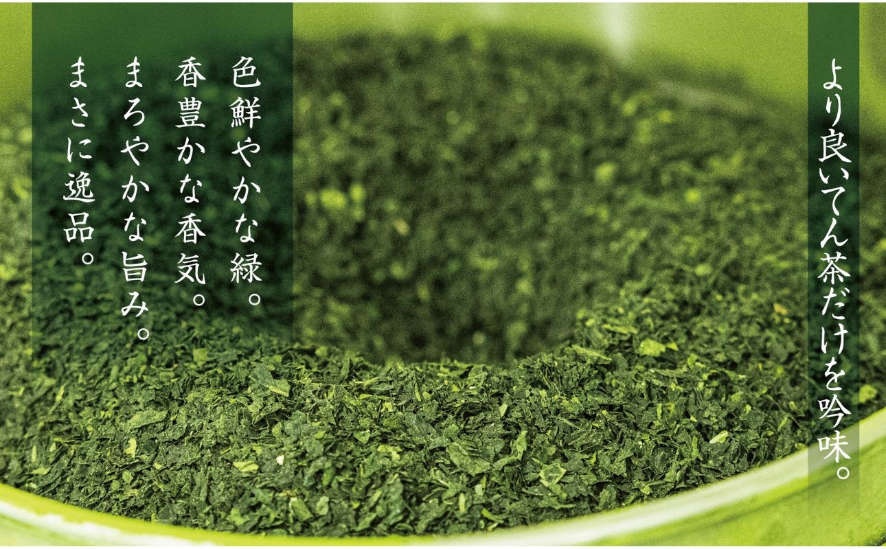 ここで育ったお茶は、綺麗な緑色が特徴で、流れる水が綺麗だからこそ、綺麗な翠(みどり)色のお茶が作れます。所有する茶畑のなかでも最も条件のよい茶畑で育った茶葉から、さらに一番良い茶葉を職人が一つ一つ選りすぐり、最上のてん茶にします。