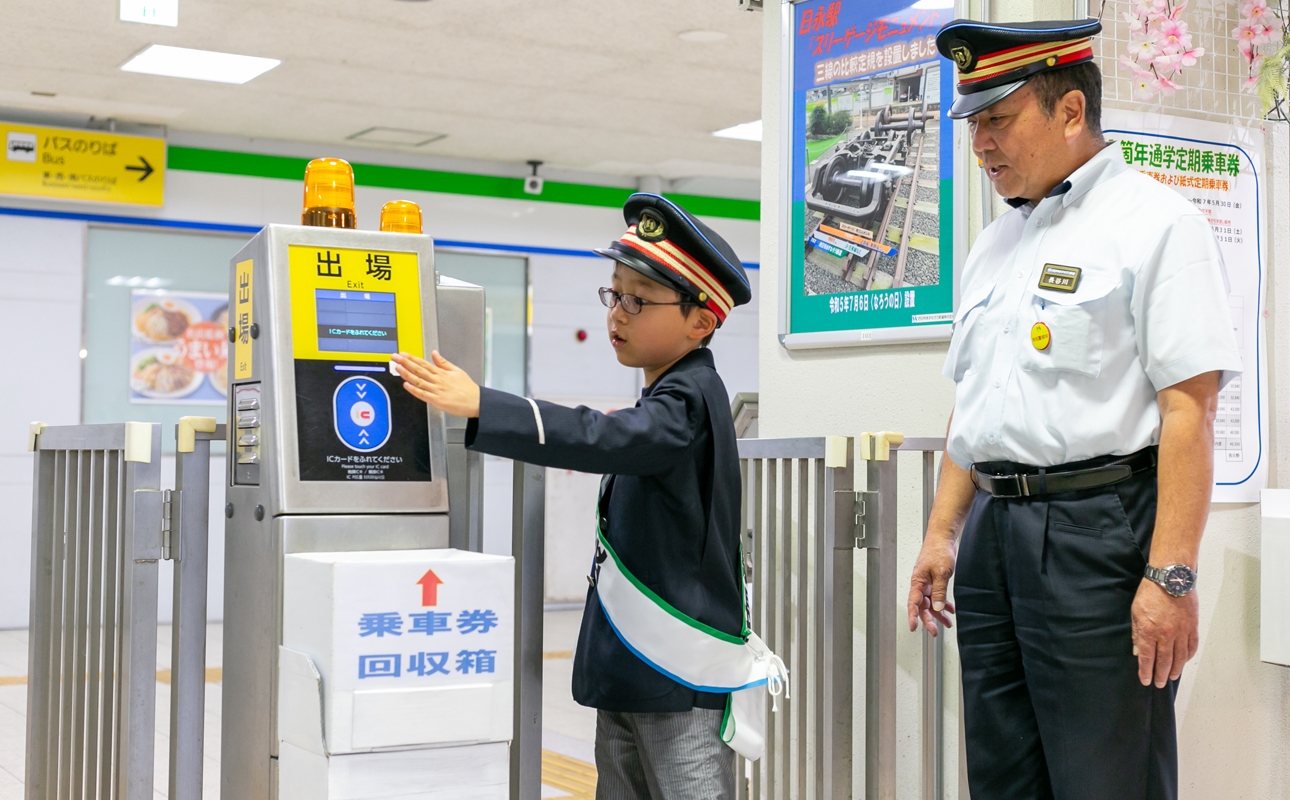 任命式後、改札での乗車券回収や列車出発の合図を実施。