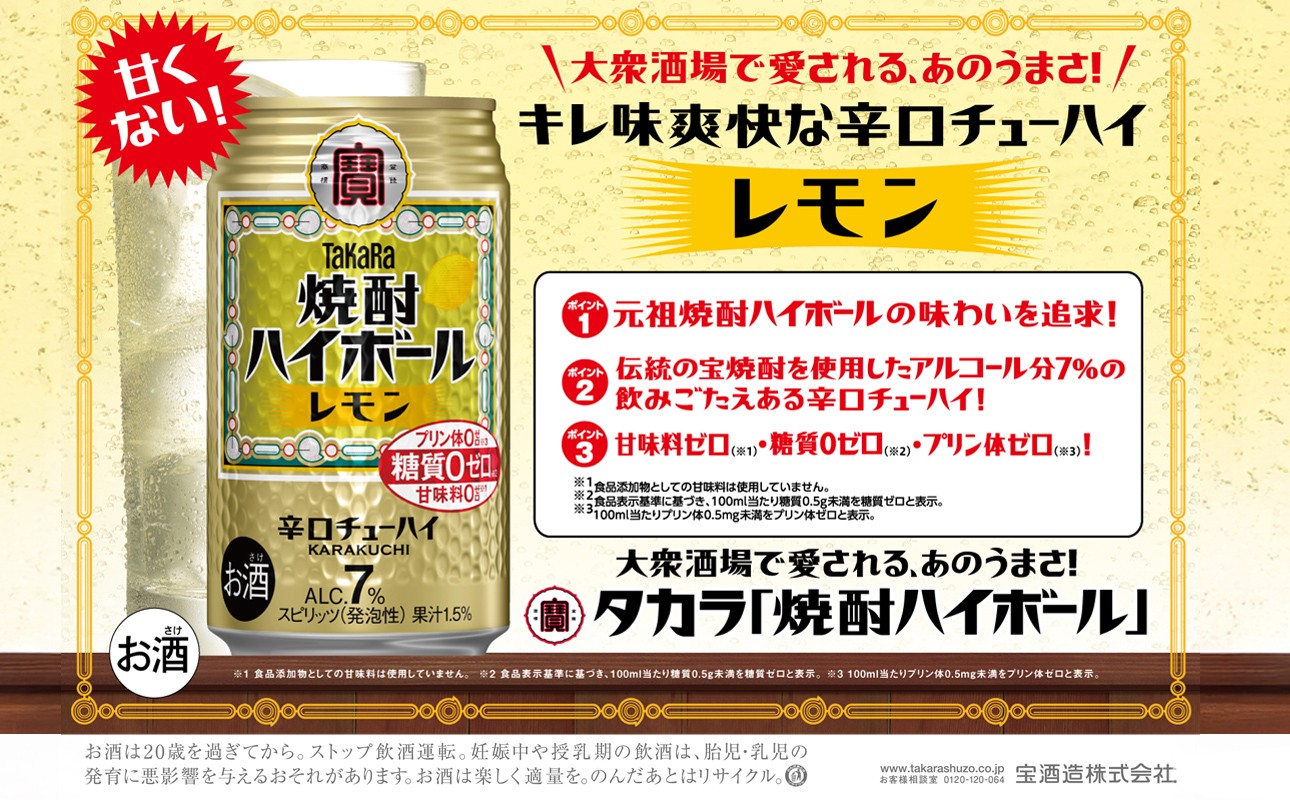 タカラ「焼酎ハイボール」は、その元祖チューハイの味わいを追求した、キレ味爽快な辛口チューハイです。