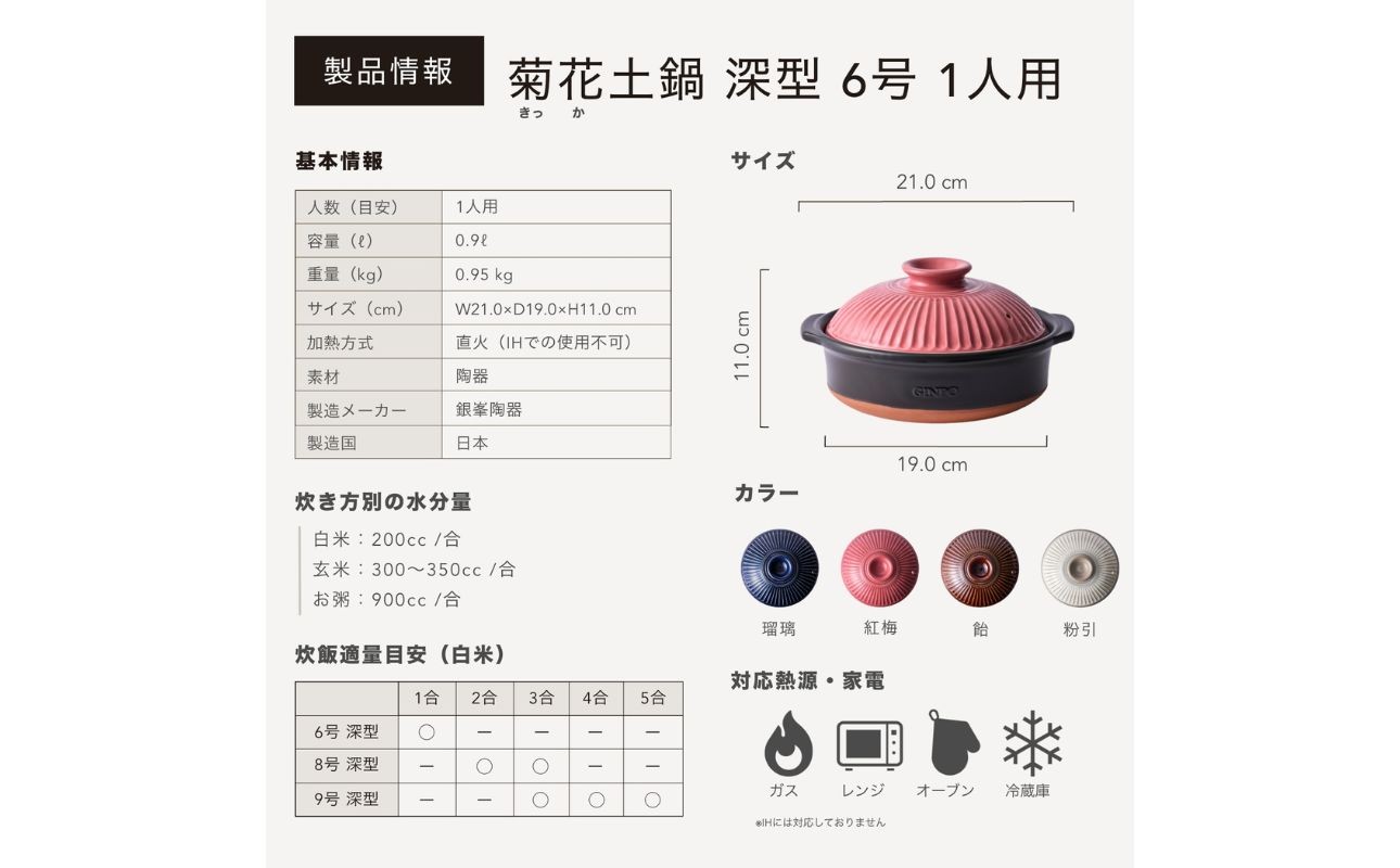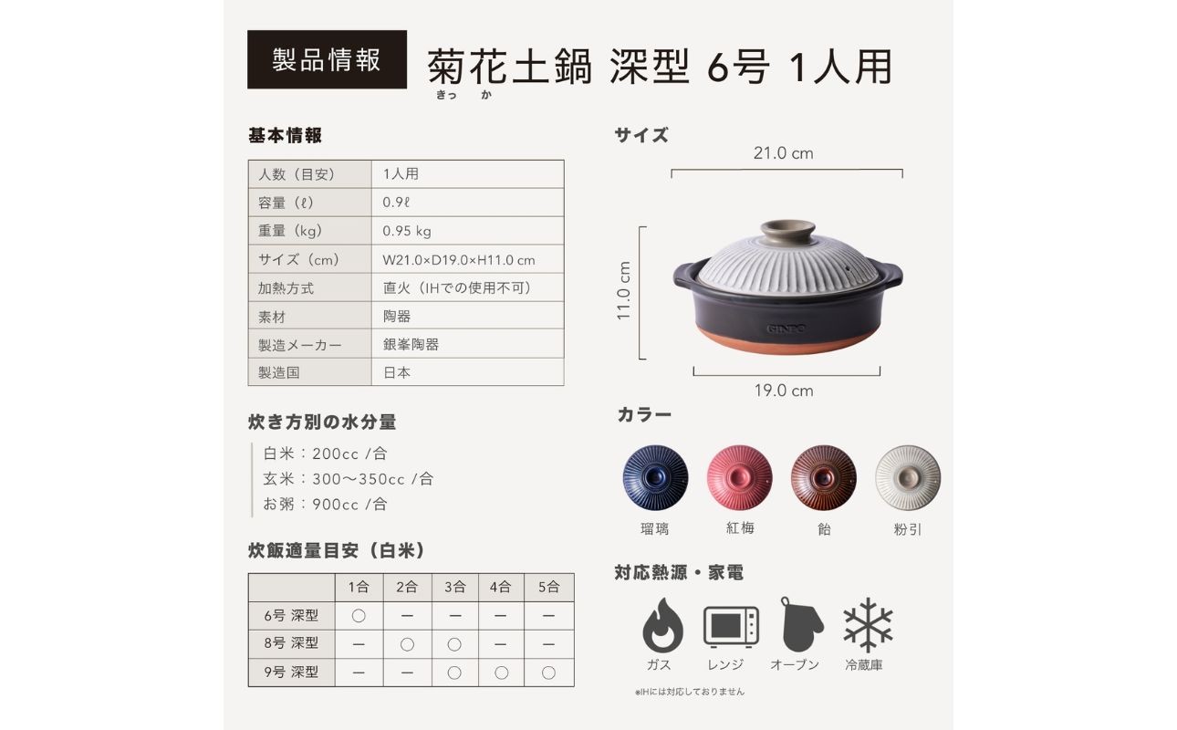 夫婦やカップルにおすすめな1合・2合炊きサイズ。 誰でも簡単に美味しい土鍋ごはんが、たった30分で作れるのがこの菊花ごはん土鍋です。 鍋の内側には水位メモリが刻まれてるため、計量カップで水を計る手間を省けます。 二重構造で吹きこぼれの心配もなく、「蒸気が見えたら火を止める」という簡単なステップで、誰でも手軽に炊き立ての美味しいご飯を楽しむことができます。 老若男女問わず、誰でも毎日使っていただけるようなデザイン。 家庭用の電子レンジに入るサイズに設計してあるため、そのまま温め直して食卓に提供することも可能です。 ※この製品は釉薬の濃淡を風合いとしています。多少のむらが生じることがありますのでご了承ください。 カラー:瑠璃・飴・粉引・紅梅 炊飯適量目安:1合~2合 ※1合用、2合用の水位目盛りがついています。 サイズ:幅21.5cm×口径19.5cm×高さ15cm 容量:1.2リットル 重さ:1,800g 対応熱源:直火、オーブン、ラジエントヒーター、レンジ 生産:銀峯陶器株式会社 事業者:株式会社G.M.P