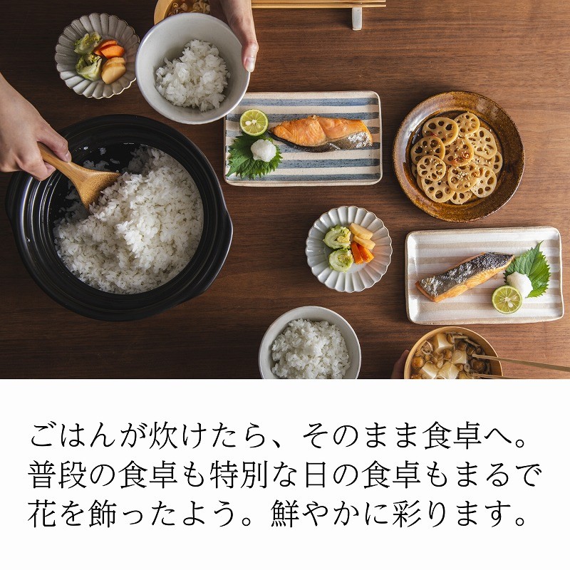 夫婦やカップルにおすすめな1合・2合炊きサイズ。 誰でも簡単に美味しい土鍋ごはんが、たった30分で作れるのがこの菊花ごはん土鍋です。 鍋の内側には水位メモリが刻まれてるため、計量カップで水を計る手間を省けます。 二重構造で吹きこぼれの心配もなく、「蒸気が見えたら火を止める」という簡単なステップで、誰でも手軽に炊き立ての美味しいご飯を楽しむことができます。 老若男女問わず、誰でも毎日使っていただけるようなデザイン。 家庭用の電子レンジに入るサイズに設計してあるため、そのまま温め直して食卓に提供することも可能です。 ※この製品は釉薬の濃淡を風合いとしています。多少のむらが生じることがありますのでご了承ください。 カラー:瑠璃・飴・粉引・紅梅 炊飯適量目安:1合~2合 ※1合用、2合用の水位目盛りがついています。 サイズ:幅21.5cm×口径19.5cm×高さ15cm 容量:1.2リットル 重さ:1,800g 対応熱源:直火、オーブン、ラジエントヒーター、レンジ 生産:銀峯陶器株式会社 事業者:株式会社G.M.P
