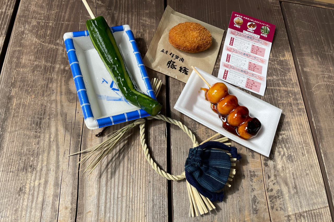 | 容量 | 大型犬用しめ縄:首回り75㎝まで 特典「愛犬のおかげでお徳ーぽん」 ①豚捨:揚げたてのコロッケ1個 ②だんご屋:みたらし団子1本 ③横丁焼の店:ミニソフトクリーム1個 ④傅兵衛:きゅうりスティック1本 ⑤若松屋:じゃこっぺ天1本 ⑥横丁焼の店:ぱんじゅう こしあん2個 ⑦いすゞ田楽:玄米団子1本 から3つお選びいただけます。 ※お徳ーぽん2枚でおみやげやのおかげ犬みくじと交換できます。 |