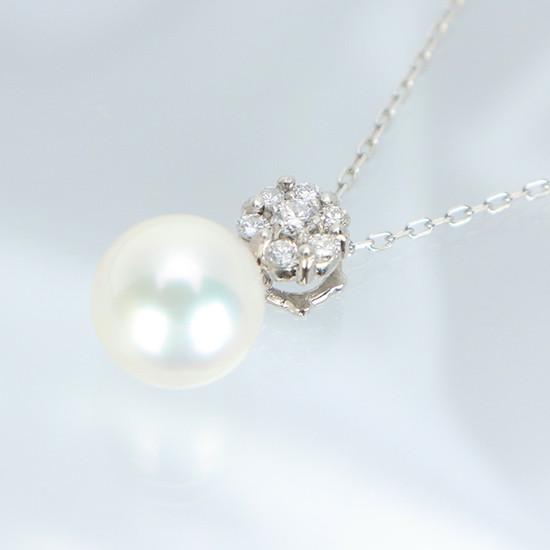 近年の真珠の不良により年々数が少なくなり高騰している花珠真珠ですので枠も高価なプラチナでトップ部分をダイヤモンドを全体にセットした優雅なフォルム