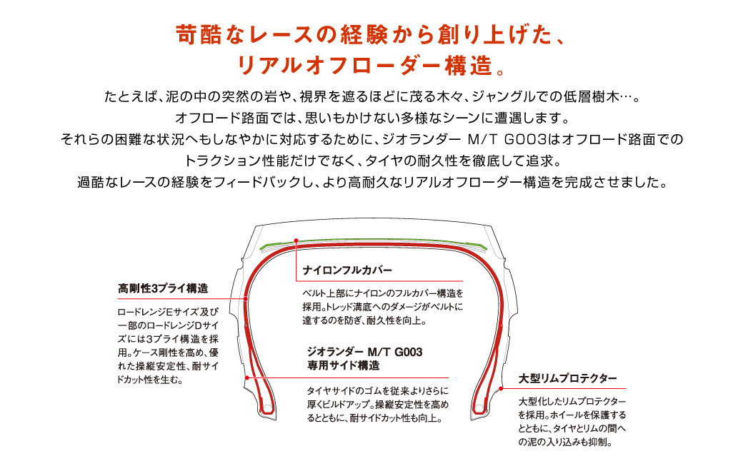 ジオランダーは1996年の誕生以来、北米でのデザートレースやアジアでのクロスカントリーラリーなど世界で数多くのレースへ参戦を続けています。それらの過酷なレース経験で得られたデータをタイヤ開発にフィードバックすることで、ジオランダーM/T G003は誕生しました。