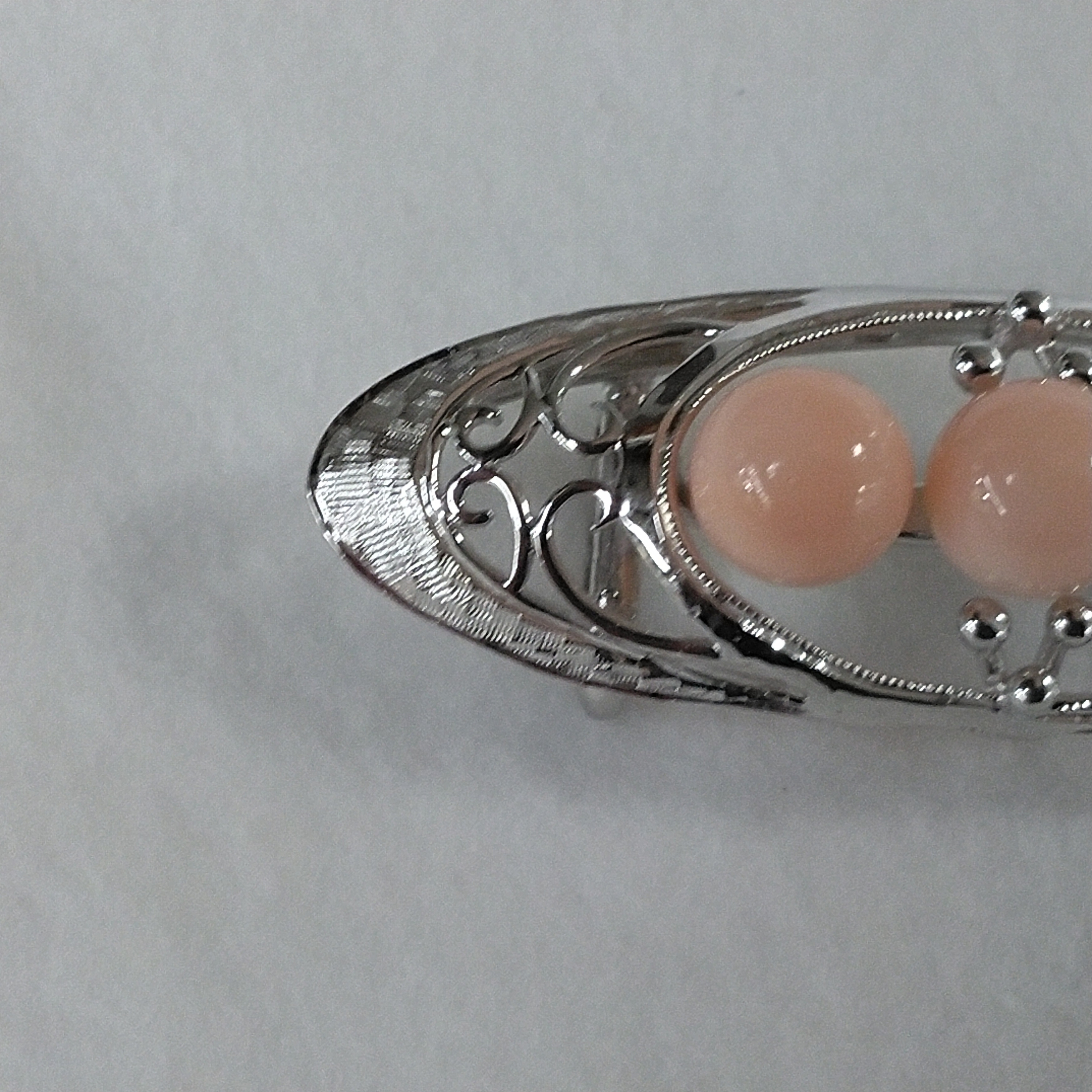 約7.0mmの深海珊瑚が3珠アレンジされた、帯留めです。金具は、シルバー製で、手彫りデザインがあります。ロジウムメッキによる変色防止加工がしてあります。三分紐用です。