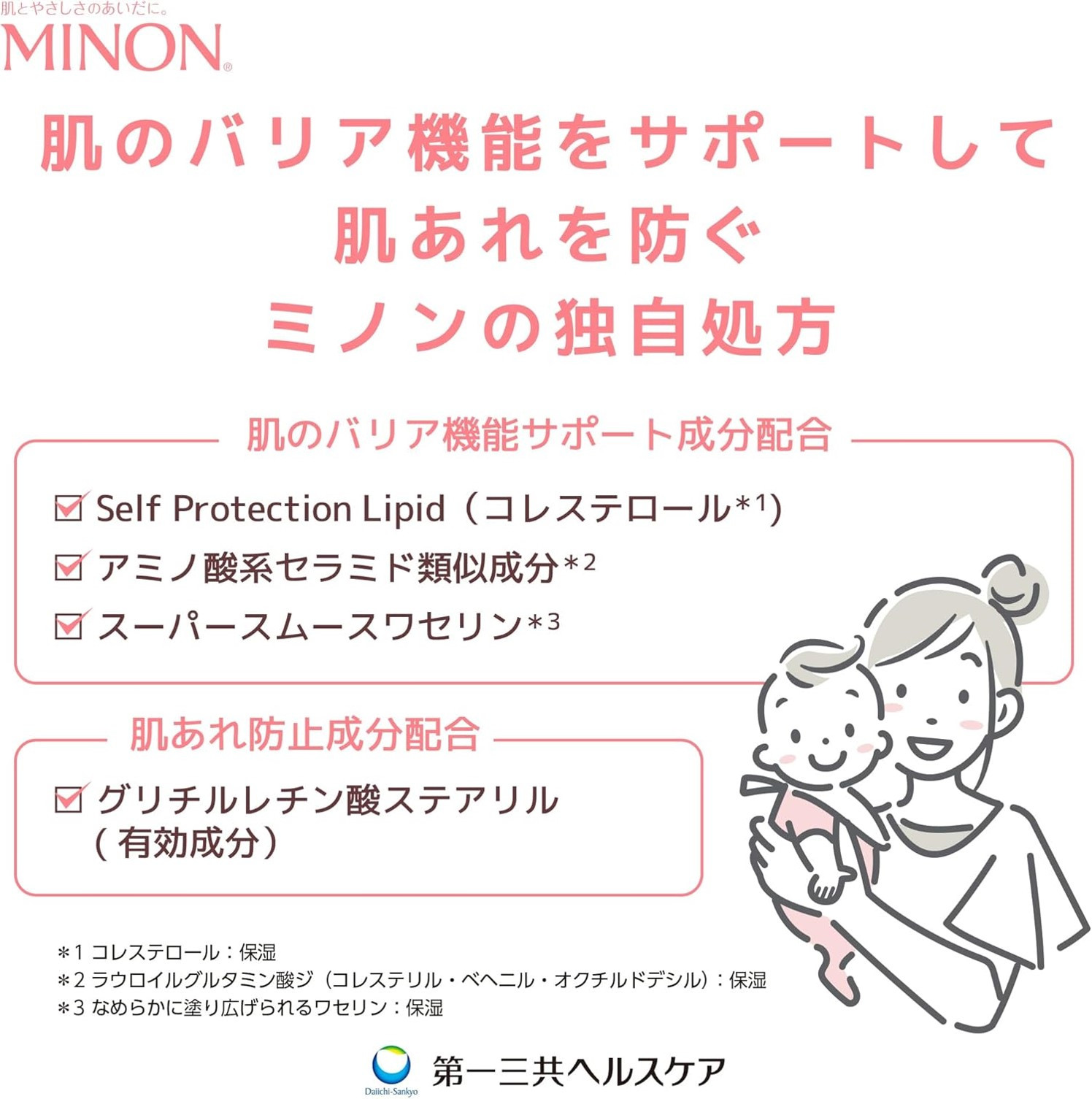 1973年、化粧品アレルギーによる肌トラブルをなくしたいという想いからミノンは誕生しました。ブランド名の由来は「3つのNon」です。Nonallergic(アレルギーの原因物質を極力カット)、Non toxic(低刺激性/低毒性)、Non alkaline(弱酸性/アルカリ性でない) 開発当時から目指しいる”3つのこだわり”で、ミノンは赤ちゃんから高齢の方までお使いいただけるために、今もこの考え方を守ったものづくりを続けています。