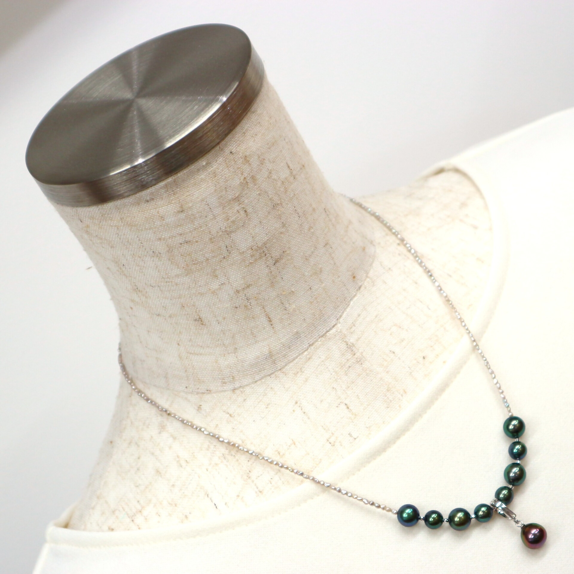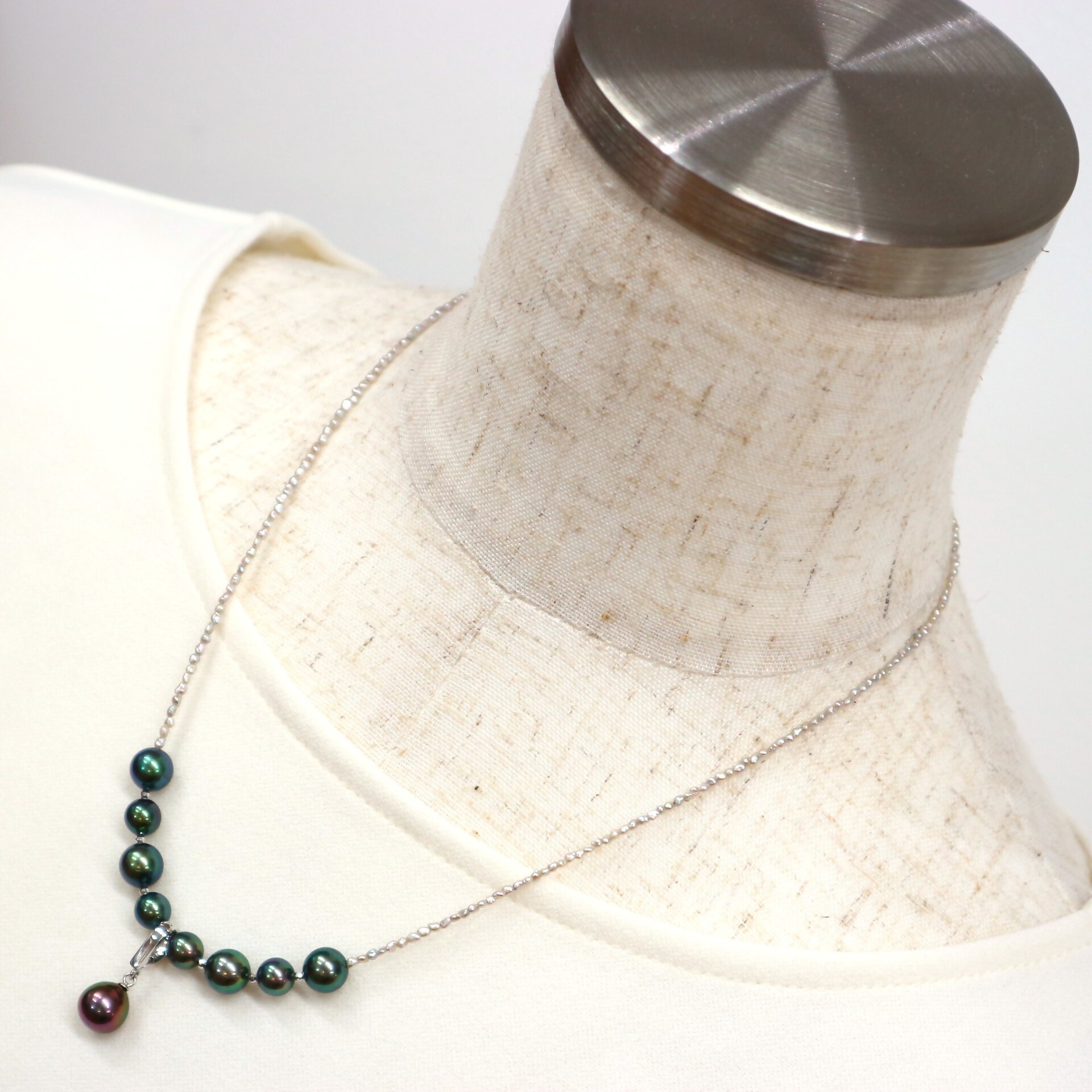 9珠のアコヤ黒真珠が胸元で美しく輝きます。