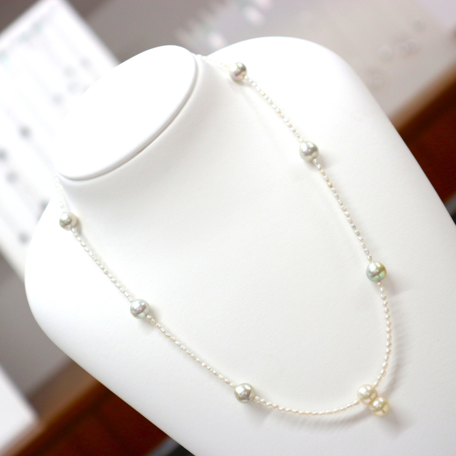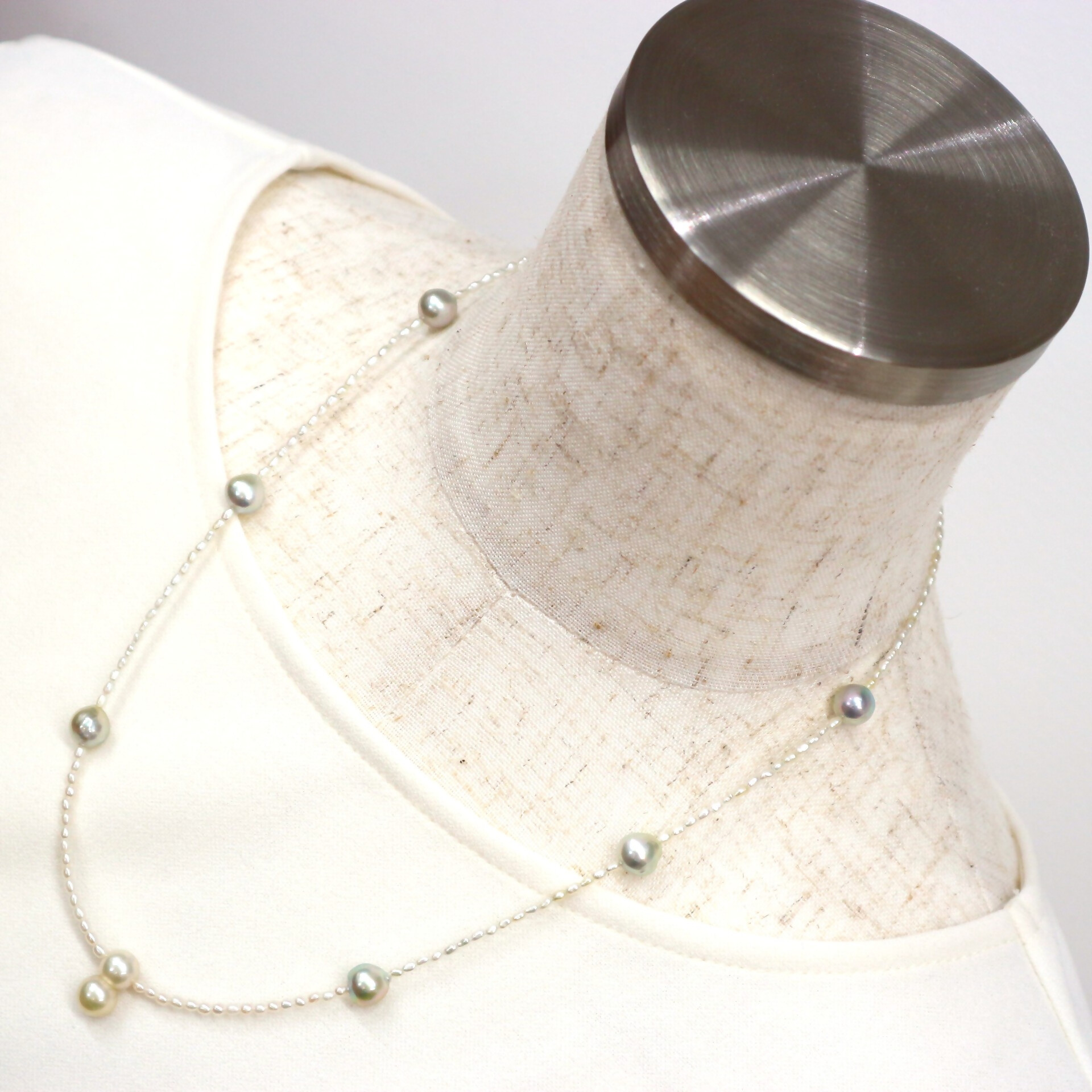 ネックレスのトップにアクセントとしてツインアコヤ真珠をあしらったデザインステーションネックレス。アコヤケシ真珠を繊細に連ね、ポイントにはナチュラルバロック真珠を配置した、印象的な一品。