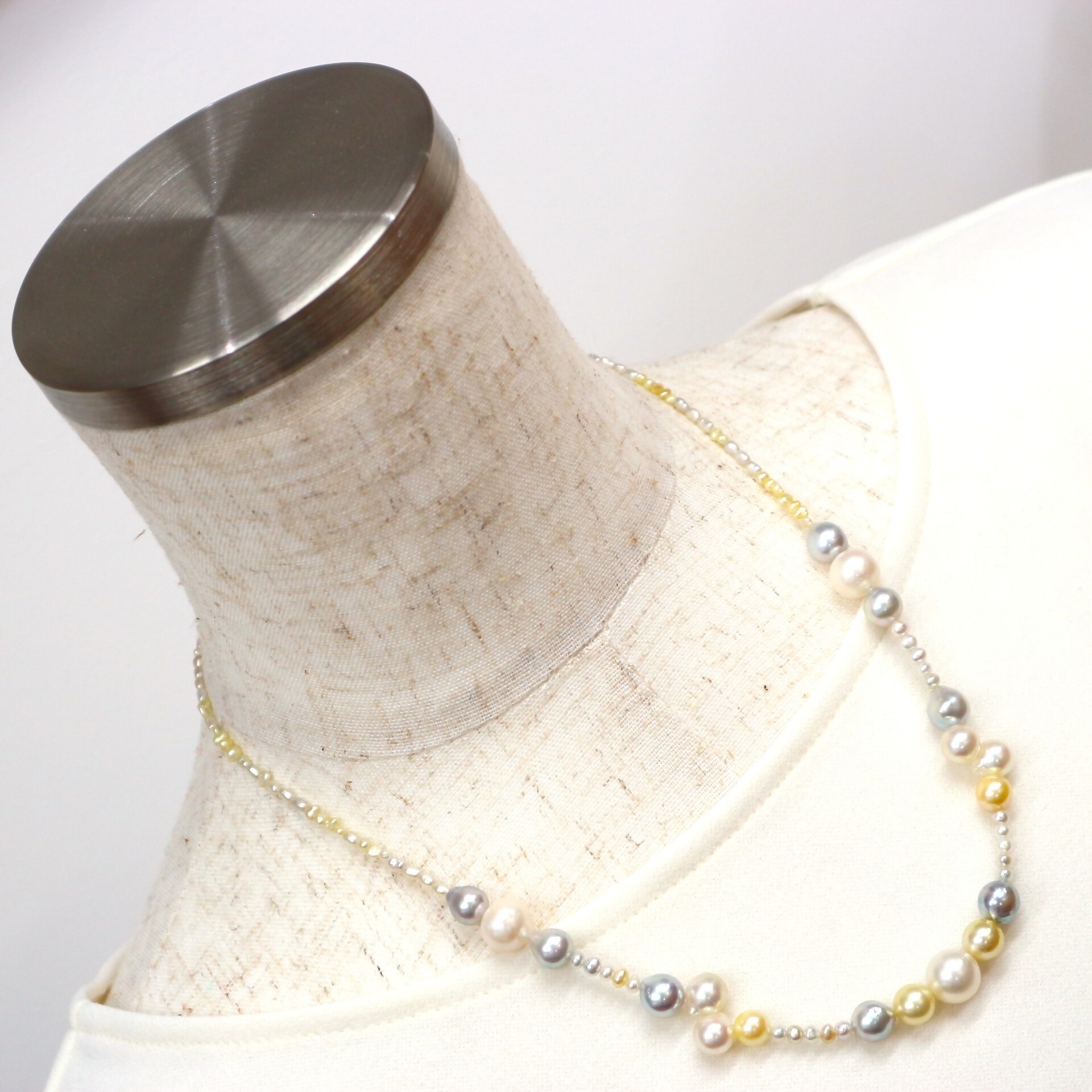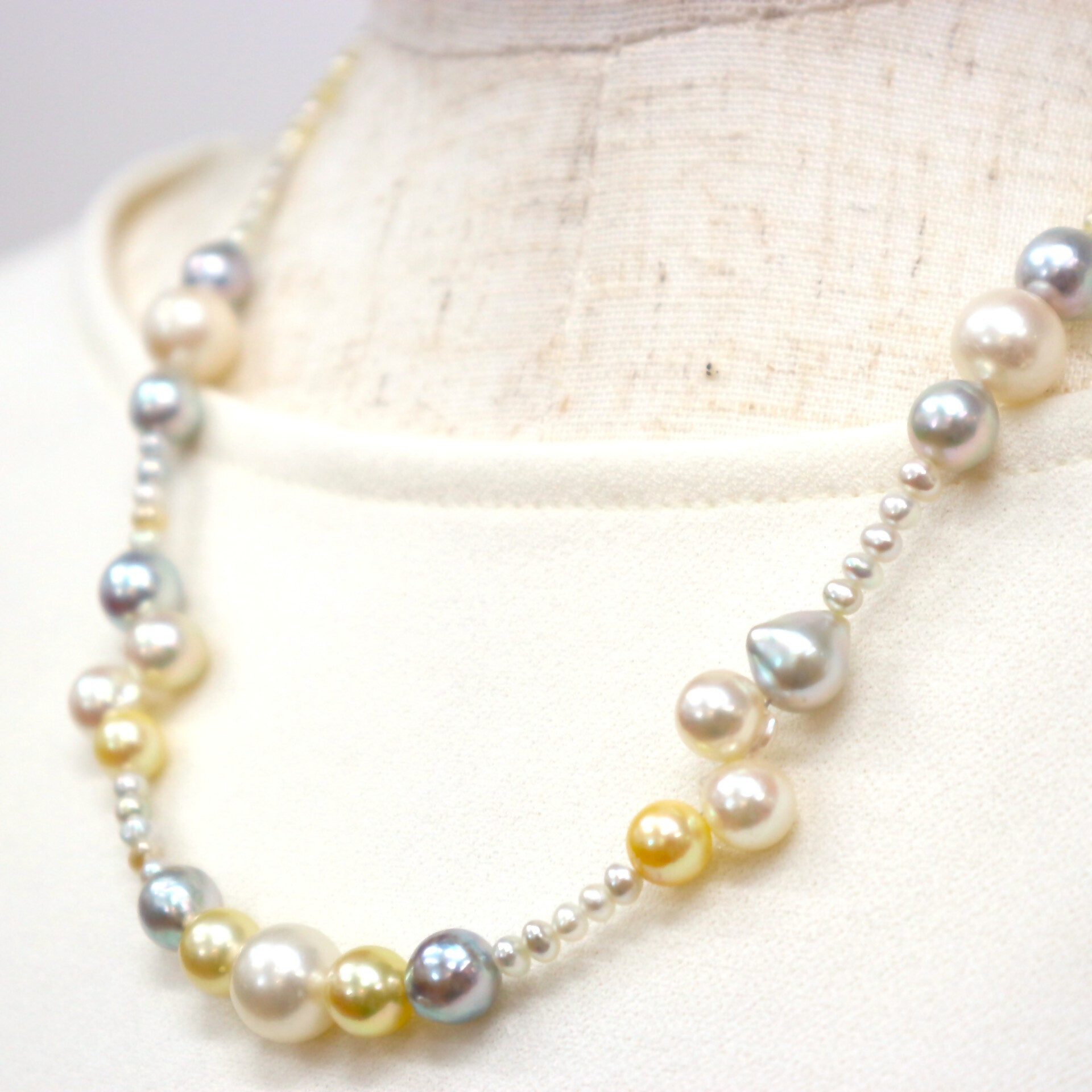 ラウンドとセミバロックの真珠の自然が織りなすそれぞれの色合いが、互いを引き立てながら、胸元を華やかに演出してくれます。