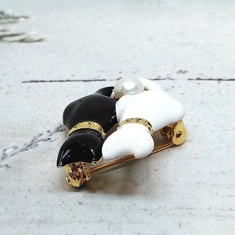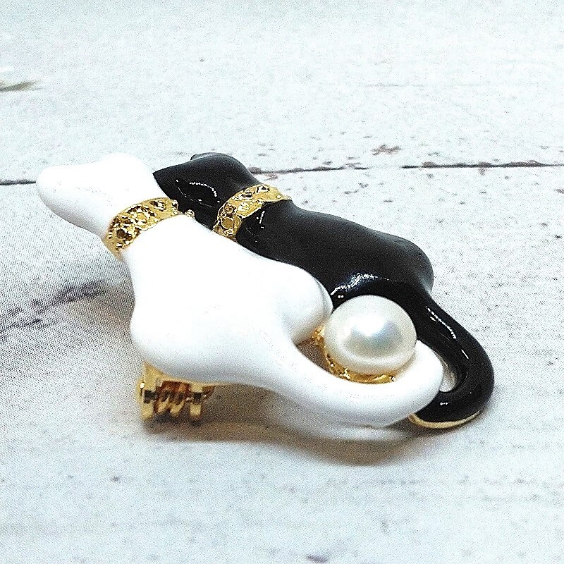 後ろ向きのネコのブローチです。白ネコと黒ネコが仲良く後ろ向きに座っています。しっぽのところに約6.0mmの淡水本真珠(ボタン形)をひと珠あしらいました。真鍮製のブローチに、白黒でカラーリングしてあります。
