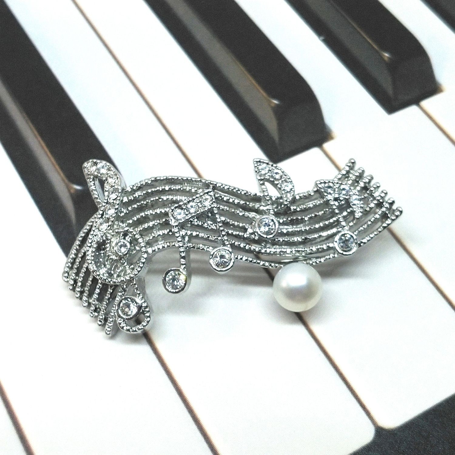 楽譜のブローチです。約6.0mmの淡水本真珠(ボタン形)をひと珠あしらいました。