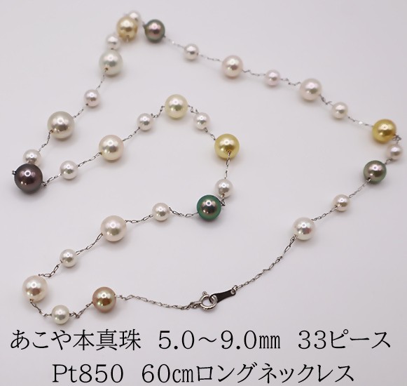 | 容量 | 素材 Pt850 あこや本真珠 5.0~9.0㎜ カラー マルチカラー まき厚 高品質 形 ラウンド てり 高品質 キズ 無傷・微小 長さ 約60㎝ |