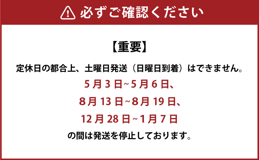 【重要】弊社の定休日の都合上、土曜日発送(日曜日到着)はできません。また、5月3日~5月6日、8月13日~8月19日、12月28日~1月7日の間は発送を停止しております。