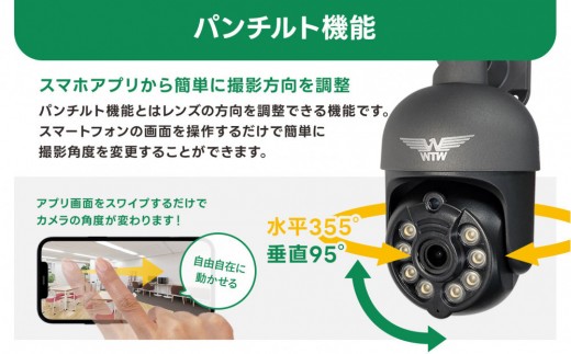 ●水平355度、垂直95度のパンチルト旋回機能を搭載、スマホで映像を見ながら見たい方向に旋回できます。