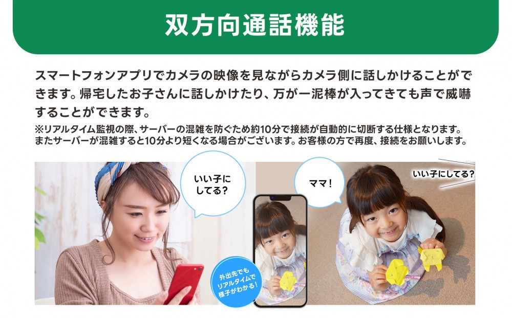 ●カメラにはスピーカーとマイクを内蔵しており、スマートフォン側で音声を聞いたり話しかけたりすることができます。