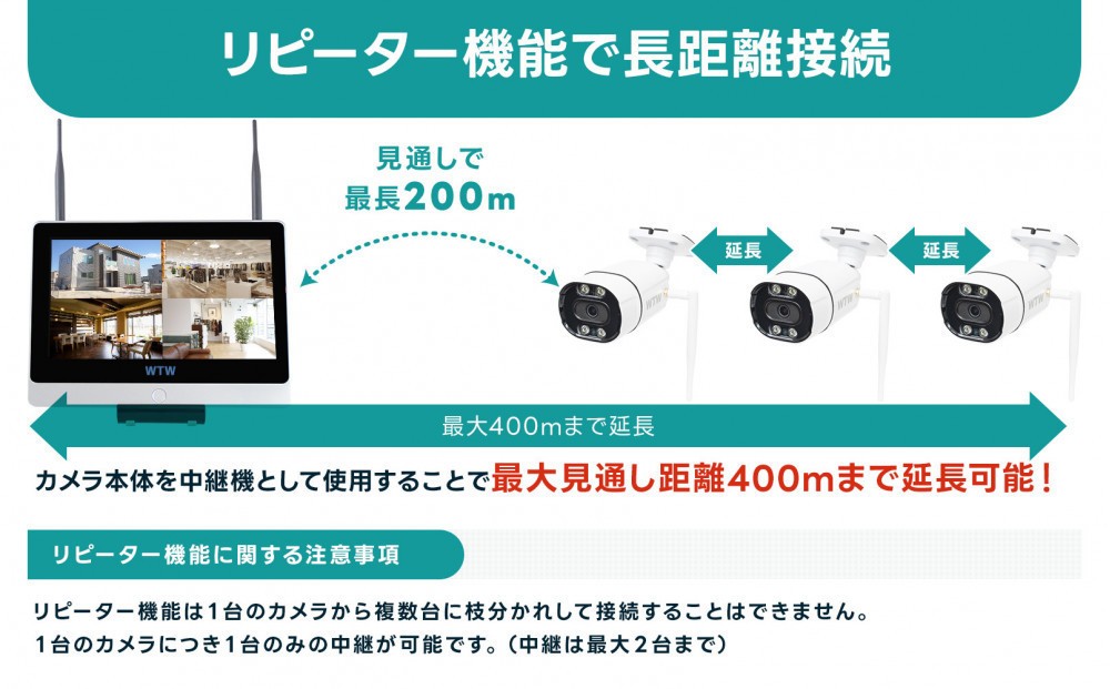 ●録画機とカメラが独自無線でつながるので、インターネット環境が無い場所でも録画可能。