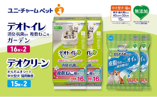 ■デオトイレ複数ねこ用 消臭・抗菌シート ガーデン ニオわない&キレイ続く ●1枚で2頭分のオシッコ1週間分を強力に消臭・吸収 ●銀イオン配合。ニオイ菌99.9%抑制 ●香りでマッチング消臭 ●シート表面が白いので、オシッコの色がわかりやすく、チェックしやすい ※愛猫1頭(体重8kgまで)の場合 ※すべての菌を抑制するわけではありません ■デオクリーンからだふきシート中大型犬・猫用香り付き 皮脂汚れやニオイ元まで拭き取るからだふきシート ●爽やかな香り付きタイプ ●ディープクレンジング処方の水分たっぷり。3層構造シートで拭くだけでシャワーしたみたいにサッパリ! ●無添加(アルコール・プロピレングリコール・パラベン不使用) ●厚手・超大判サイズ30cm×20cm ※画像はイメージです。パッケージが画像と異なる場合がございます。 ※通常ご寄附頂いてから1~2ヶ月以内にお届けしております。 ※年末年始など寄附のお申し込みが集中した場合は、お届けまで数か月かかる場合がございます。予めご了承ください。 ※備考欄等へ日時指定を記入いただいた場合も、対応致しかねますのでご注意ください。