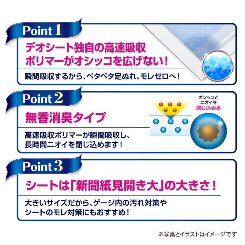 ●オシッコを瞬間吸収して長時間ニオイを閉じ込める無香消臭タイプ。