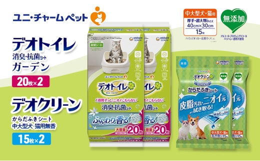■デオトイレ消臭・抗菌 シート ナチュラルガーデン ニオわない&キレイ続く ●1週間分の尿をしっかり吸収し、抗菌剤がニオイを強力に抑えます ●銀イオン配合。ニオイ菌99.9%抑制 ●香りでマッチング消臭 ●シート表面が白いので、オシッコの色がわかりやすく、チェックしやすい ※愛猫1頭(体重8kgまで)の場合 ※すべての菌を抑制するわけではありません ■デオクリーンからだふきシート中大型犬・猫用無香 皮脂汚れやニオイ元まで拭き取るからだふきシート ●香りが苦手なワンちゃん・ネコちゃんにも安心な無香タイプ。 ●ディープクレンジング処方の水分たっぷり。3層構造シートで拭くだけでシャワーしたみたいにサッパリ! ●無添加(アルコール・プロピレングリコール・パラベン・香料不使用) ●厚手・超大判サイズ40cm×30cm ※画像はイメージです。パッケージが画像と異なる場合がございます。 ※通常ご寄附頂いてから1~2ヶ月以内にお届けしております。 ※年末年始など寄附のお申し込みが集中した場合は、お届けまで数か月かかる場合がございます。予めご了承ください。 ※備考欄等へ日時指定を記入いただいた場合も、対応致しかねますのでご注意ください。