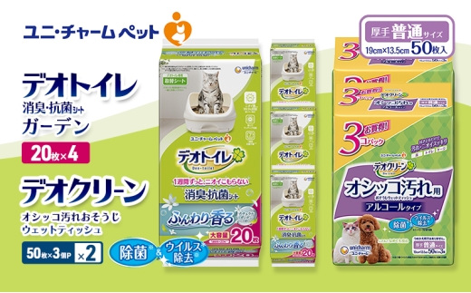 ■デオトイレ消臭・抗菌 シート ナチュラルガーデン ニオわない&キレイ続く ●1週間分の尿をしっかり吸収し、抗菌剤がニオイを強力に抑えます ●銀イオン配合。ニオイ菌99.9%抑制 ●香りでマッチング消臭 ●シート表面が白いので、オシッコの色がわかりやすく、チェックしやすい ※愛猫1頭(体重8kgまで)の場合 ※すべての菌を抑制するわけではありません ■デオクリーンオシッコ汚れおそうじウェットティッシュ大判 オシッコ汚れおそうじ用アルコール除菌&ウィルス除去ウェットティッシュ ●拭きあとペットがなめても安心 ●厚手・超大判サイズ30cm×20cm ※全ての菌・ウイルスを除去するわけではありません。対物拭き取り試験での効果 ※画像はイメージです。パッケージが画像と異なる場合がございます。 ※通常ご寄附頂いてから1~2ヶ月以内にお届けしております。 ※年末年始など寄附のお申し込みが集中した場合は、お届けまで数か月かかる場合がございます。予めご了承ください。 ※備考欄等へ日時指定を記入いただいた場合も、対応致しかねますのでご注意ください。