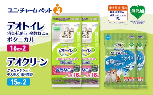 ■デオトイレ複数ねこ用 消臭・抗菌シート ボタニカル ニオわない&キレイ続く ●1枚で2頭分のオシッコ1週間分を強力に消臭・吸収 ●銀イオン配合。ニオイ菌99.9%抑制 ●香りでマッチング消臭 ●シート表面が白いので、オシッコの色がわかりやすく、チェックしやすい ※愛猫1頭(体重8kgまで)の場合 ※すべての菌を抑制するわけではありません ■デオクリーンからだふきシート中大型犬・猫用香り付き 皮脂汚れやニオイ元まで拭き取るからだふきシート ●爽やかな香り付きタイプ ●ディープクレンジング処方の水分たっぷり。3層構造シートで拭くだけでシャワーしたみたいにサッパリ! ●無添加(アルコール・プロピレングリコール・パラベン不使用) ●厚手・超大判サイズ30cm×20cm ※画像はイメージです。パッケージが画像と異なる場合がございます。 ※通常ご寄附頂いてから1~2ヶ月以内にお届けしております。 ※年末年始など寄附のお申し込みが集中した場合は、お届けまで数か月かかる場合がございます。予めご了承ください。 ※備考欄等へ日時指定を記入いただいた場合も、対応致しかねますのでご注意ください。